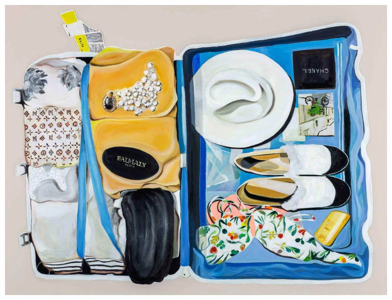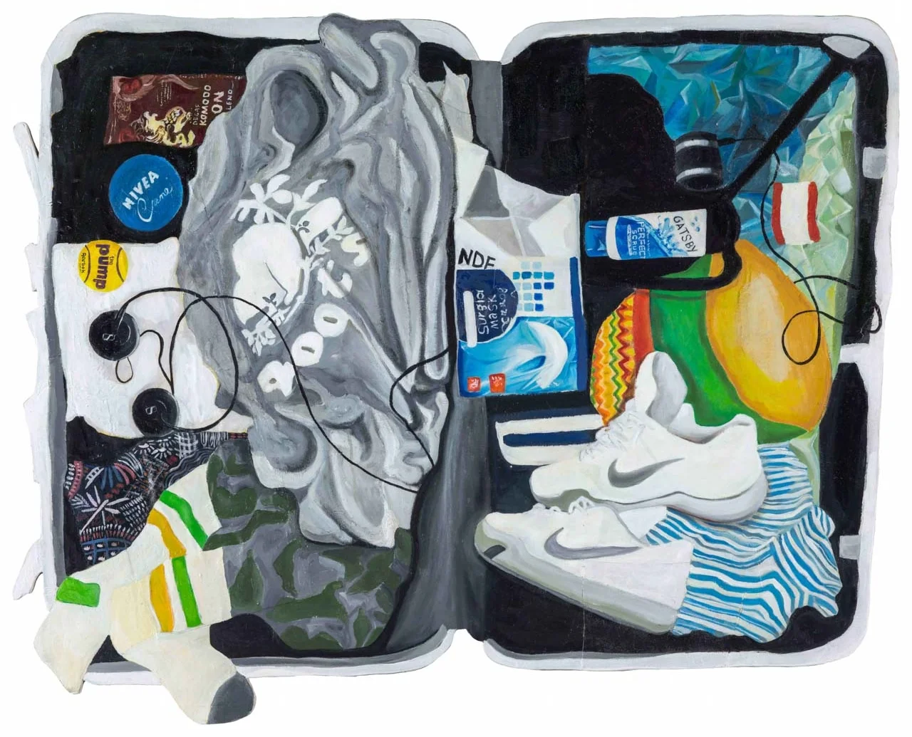 如同土耳其作家帕慕克在他的著作《伊斯坦堡:一座城市的記憶》裡敘述的:『外人看一座城市的時候,感興趣的是異國情調或美景。而對當地人來說,其聯繫始終參雜著回憶』如果我們只是先不加思索的第一眼觀看郭彥甫一系列〈旅行箱〉作品,其間穿插著許多不同的趣味,如同欣賞一幅幅不同的風景,高山流水小橋平原幻化成球鞋T恤鴨舌帽與保養品。在每一幅風景前,我們駐足欣賞,想像著自己身在其中的心情,而當這些主體變成日常用品時我們開始想像:誰是這些物品的主人?他的習慣是甚麼?甚至開始揣想,旅行箱的主人是男是女,高矮胖瘦,個姓是溫柔或是暴烈,此人有甚麼特殊的喜好?如同偵探小說裡的福爾摩斯,依著每個細微的線索拼湊出這個人的模樣。