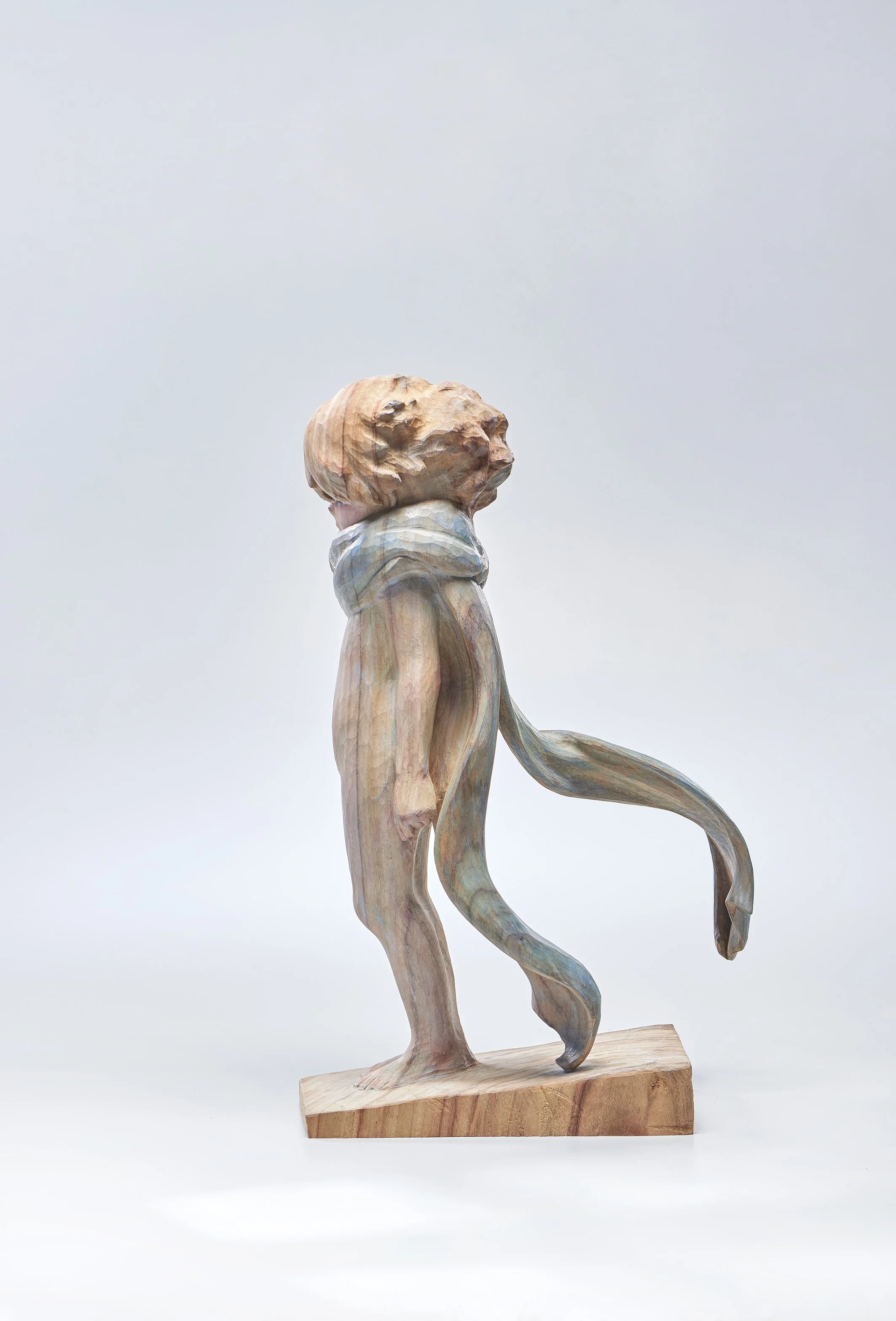 Alone and lonely, time stands still, like a forgotten child, sitting or lying down, sometimes looking up far into the distance, hoping against hope, sometimes closing eyes silently and quietly, the girl seems sad and fragile. It is the contrast and contradiction of one’s inner world, just like little children wish to grow up and the grown hope to get back to childhood. Leaving clear chisel marks, Liu Shin-Yi’s sculptures look like every track of life, so deep, without covering up, while adding on beautiful sweet colours, they look as if the protective colours for hiding real-self during the growing stage. The sad, desperate face means a result of the conflict between her initial dream and anticipation. At last, drawing back the original real-self, she chooses to retain the beautiful innocent form to face the world.