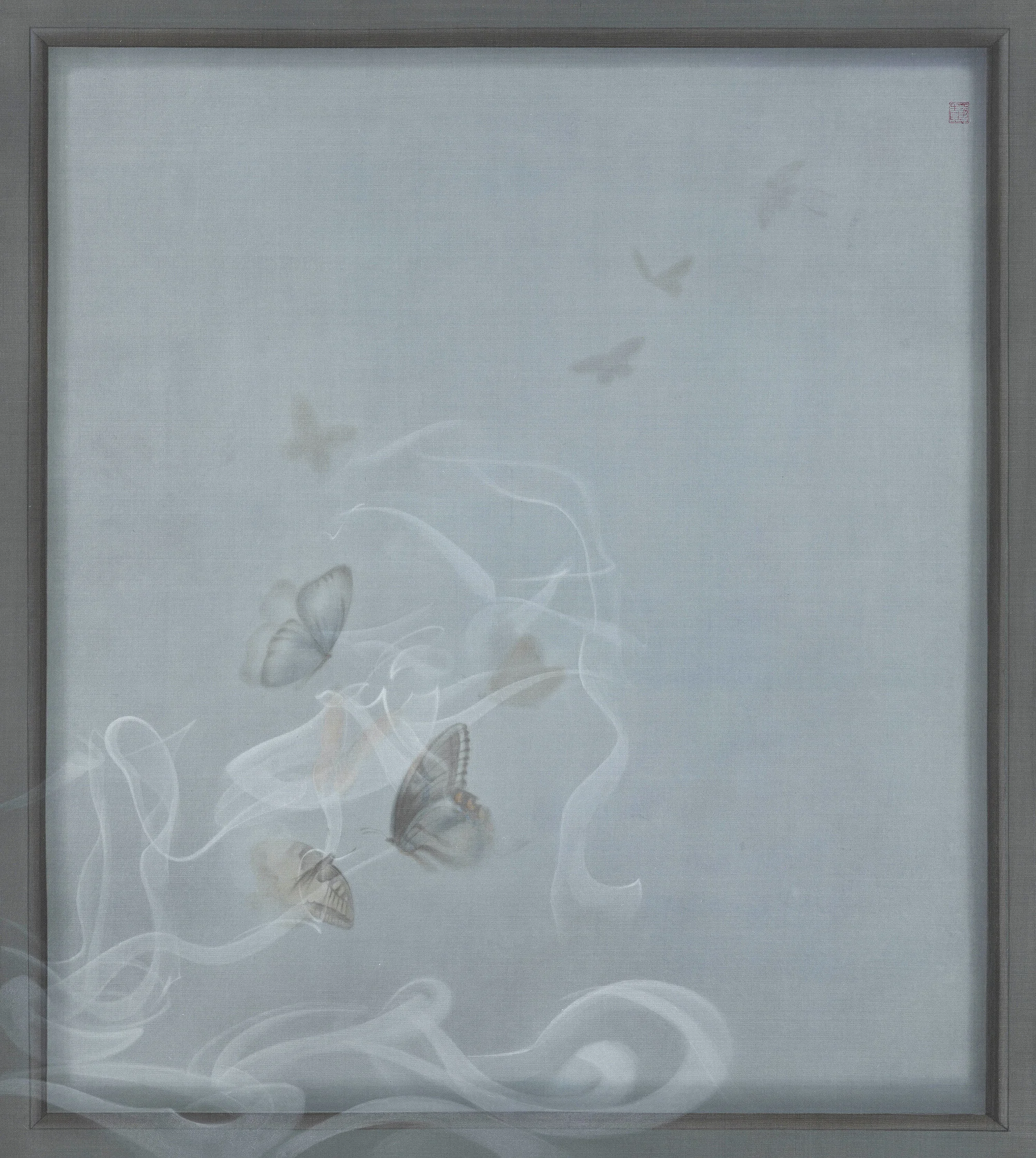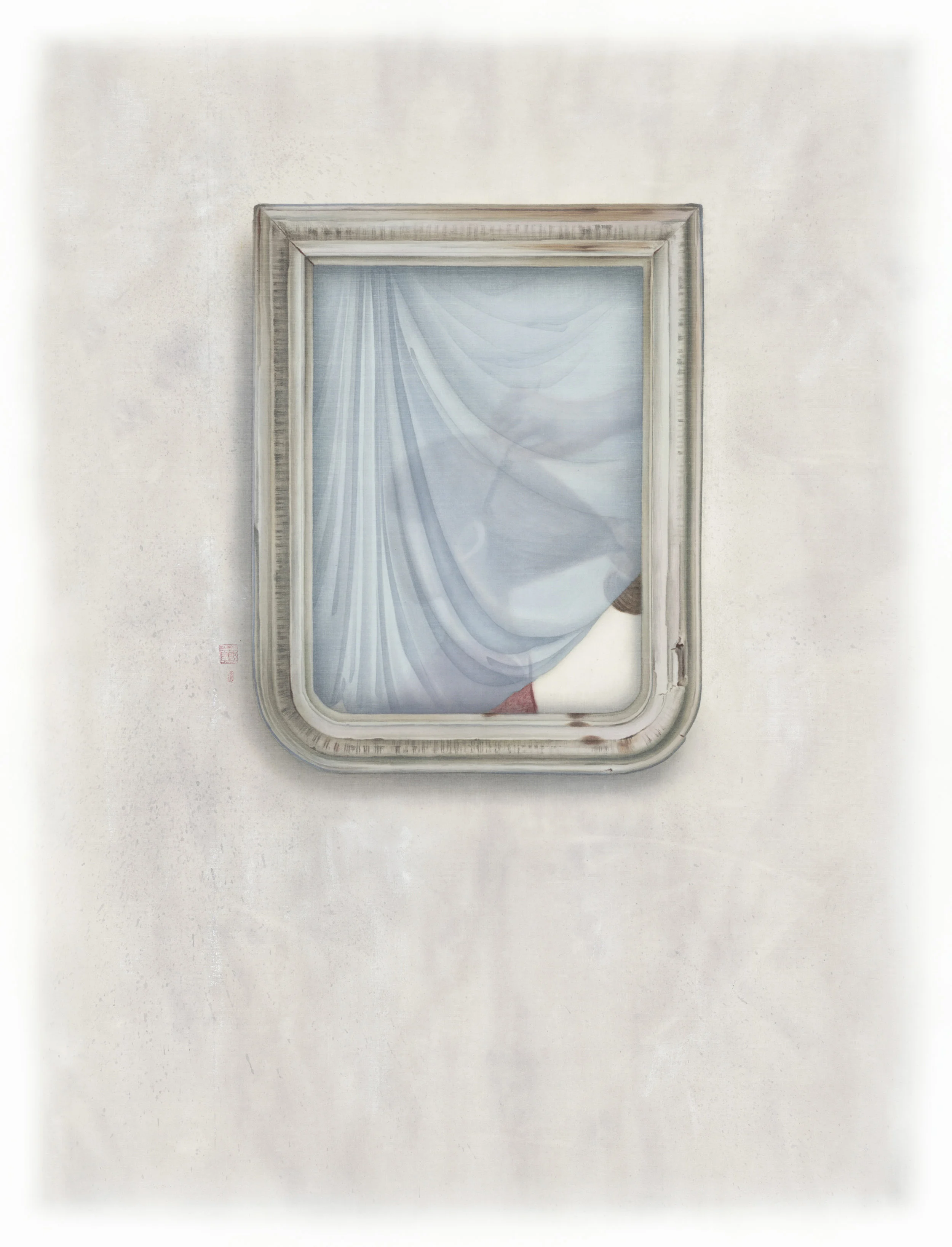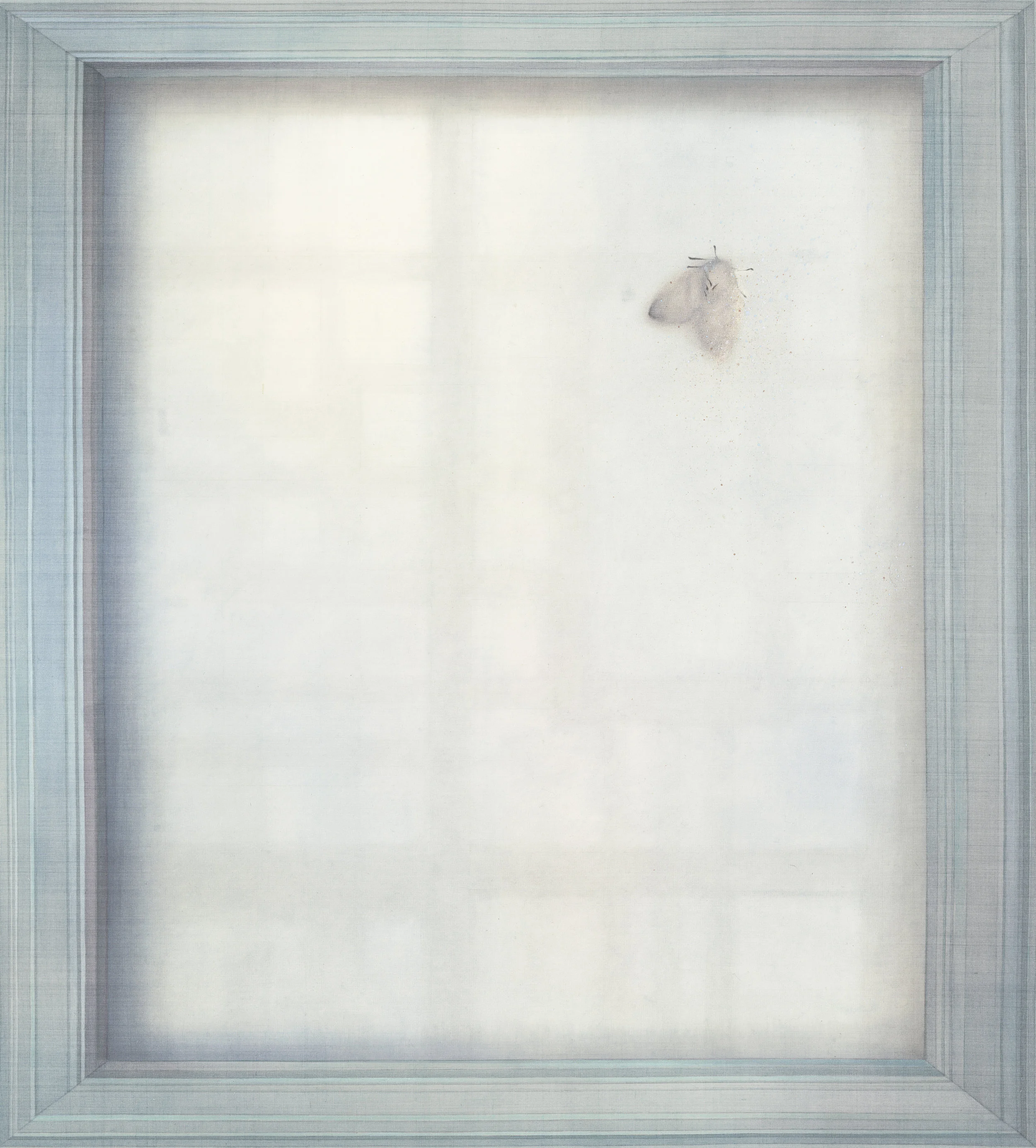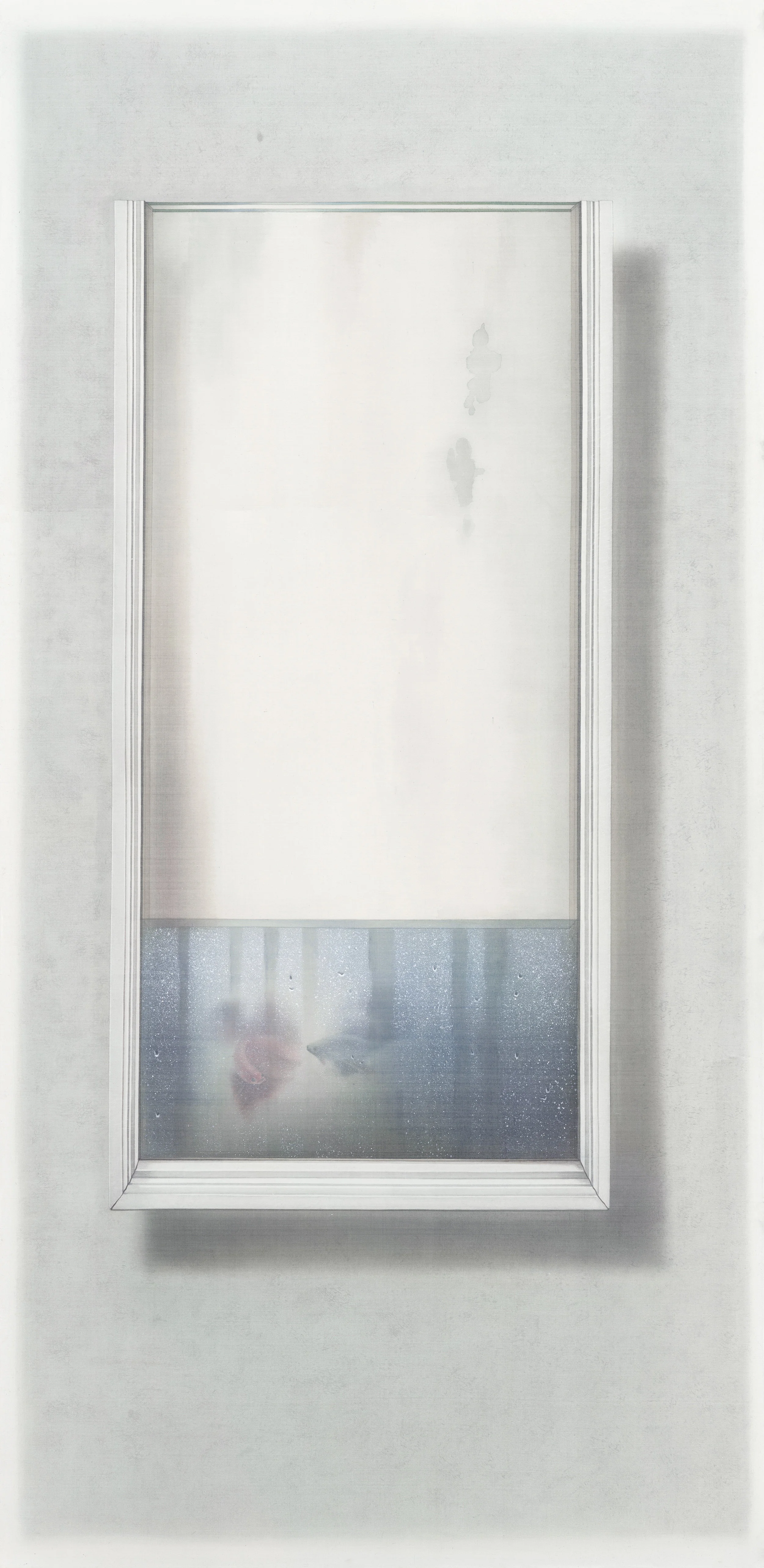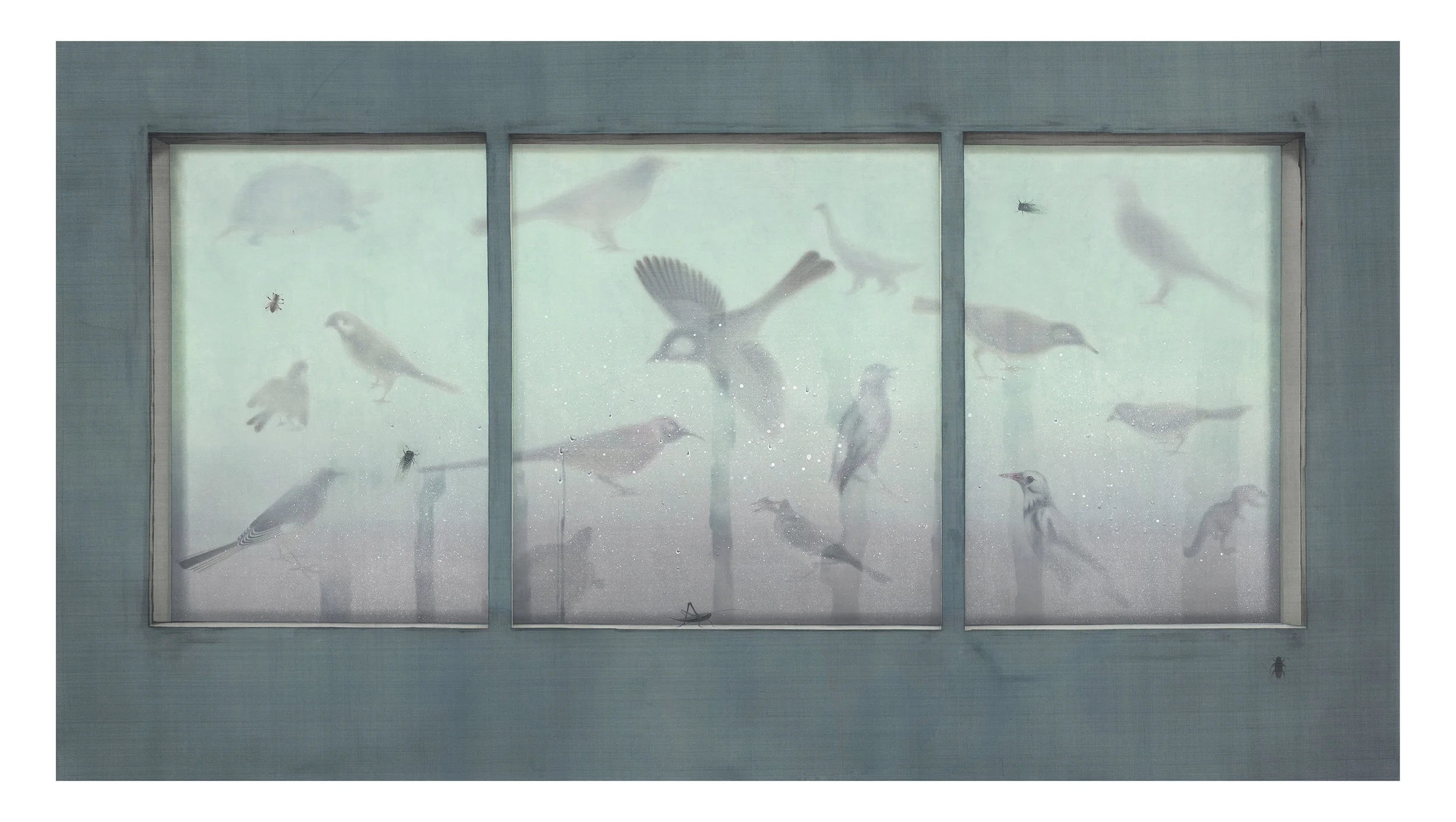 然而,框架彼端刻正發生、上演的種種「事件」,究竟是什麼?是一種真實、現象,或兩者皆是?是生活日記的斷簡殘篇、手不盈握的虛無夢靨,抑或是過往記憶的重新搬演?透過玻璃、鏡面所呈現的物像,可能是折射自此端的虛影,同時又是現存於彼端的實景,難以辨識。此外,框架上被凝視與再現的物件,如昆蟲、鳥類、動物、紗簾、窗格、室內、植物、霧氣凝結與塗鴉等,以平貼或縮景的手法拉近彼此,反轉介面內外既有的物理性相對關係,形成凝視與被凝視的心理性絕對關係。例如,〈半夏〉中的粉蛾、〈竹影〉中的紗簾,像是處在貼近此端的介質之外,然其背後的影像卻反轉這樣的邏輯,實物被鏡像所取代。