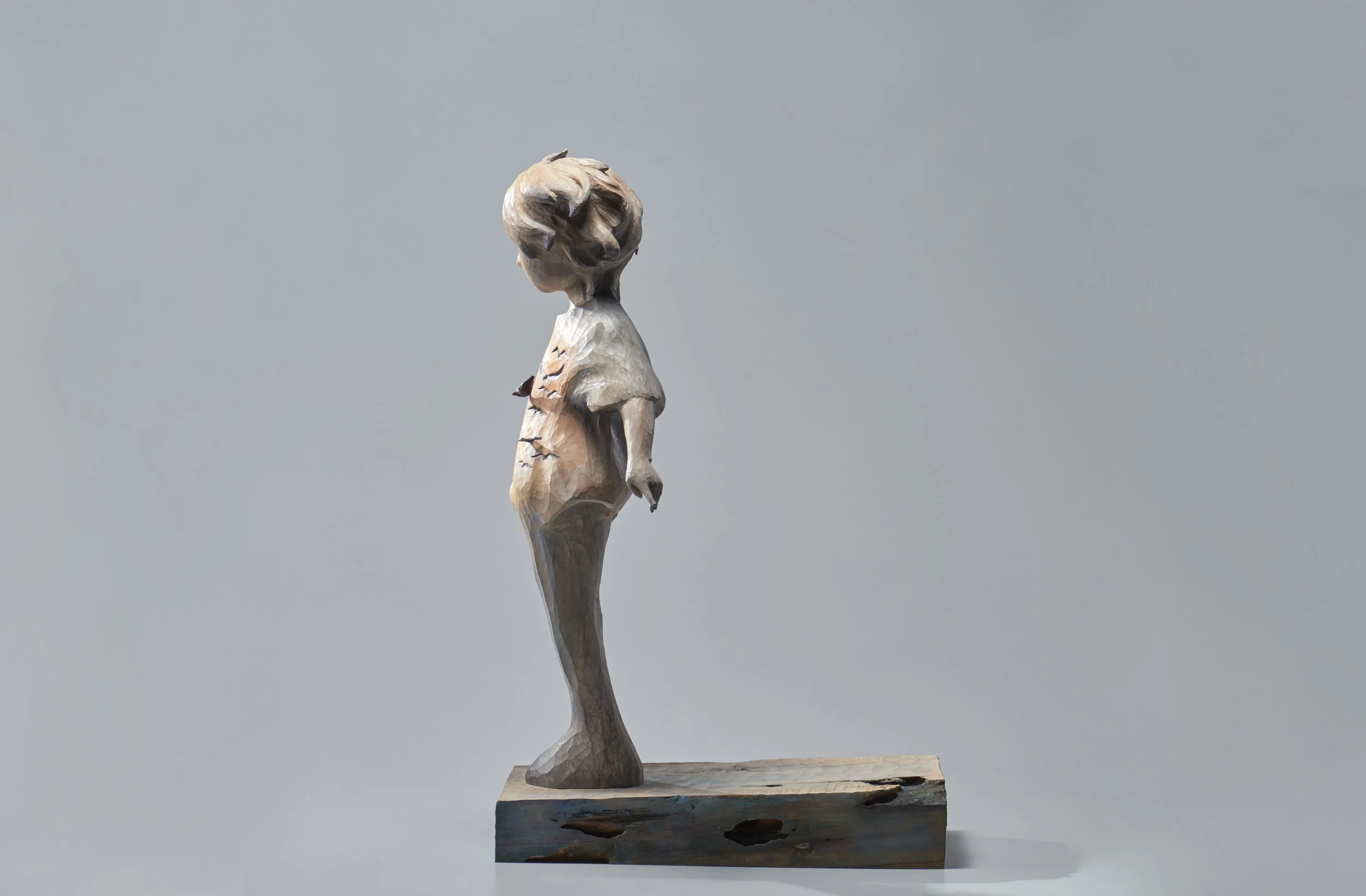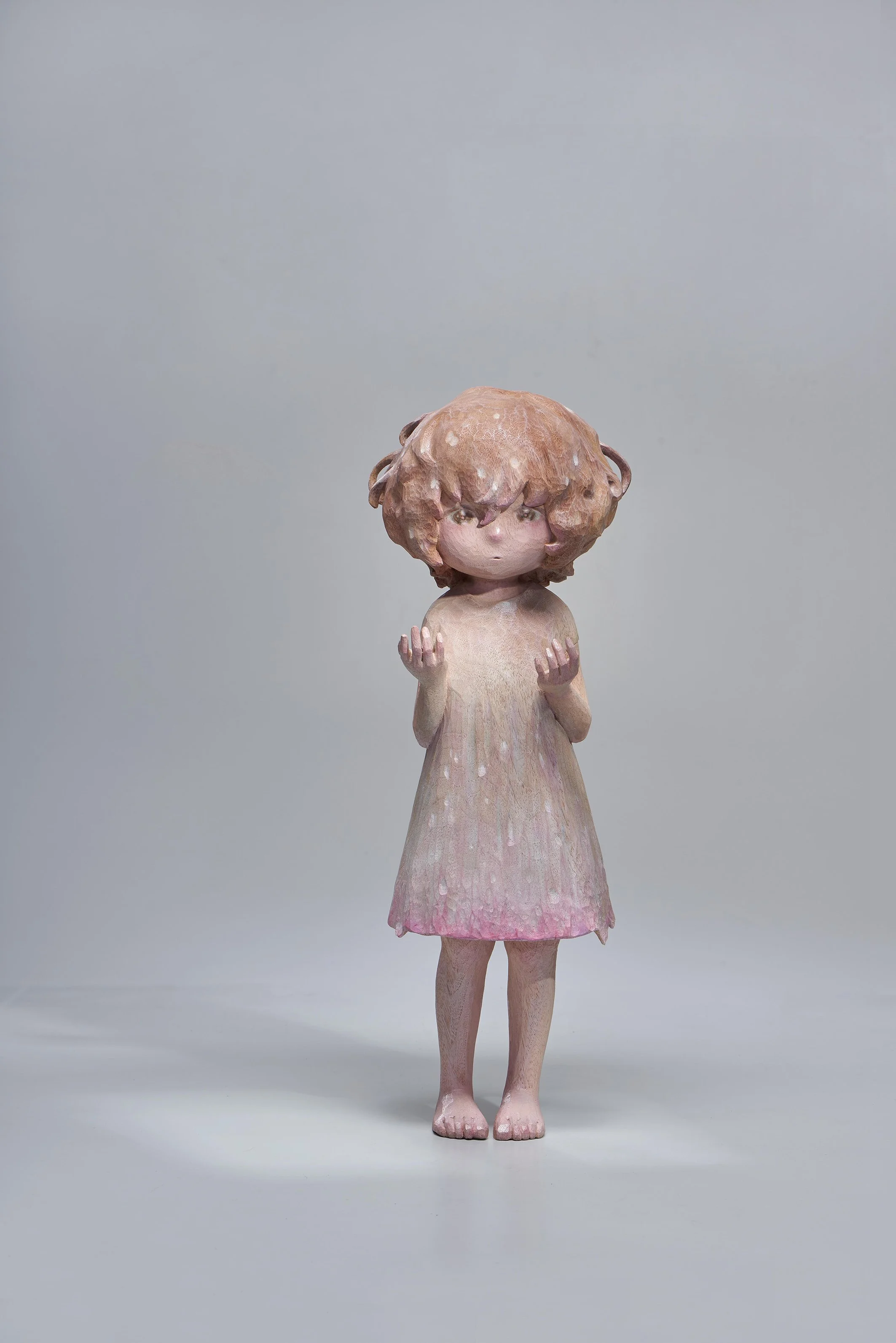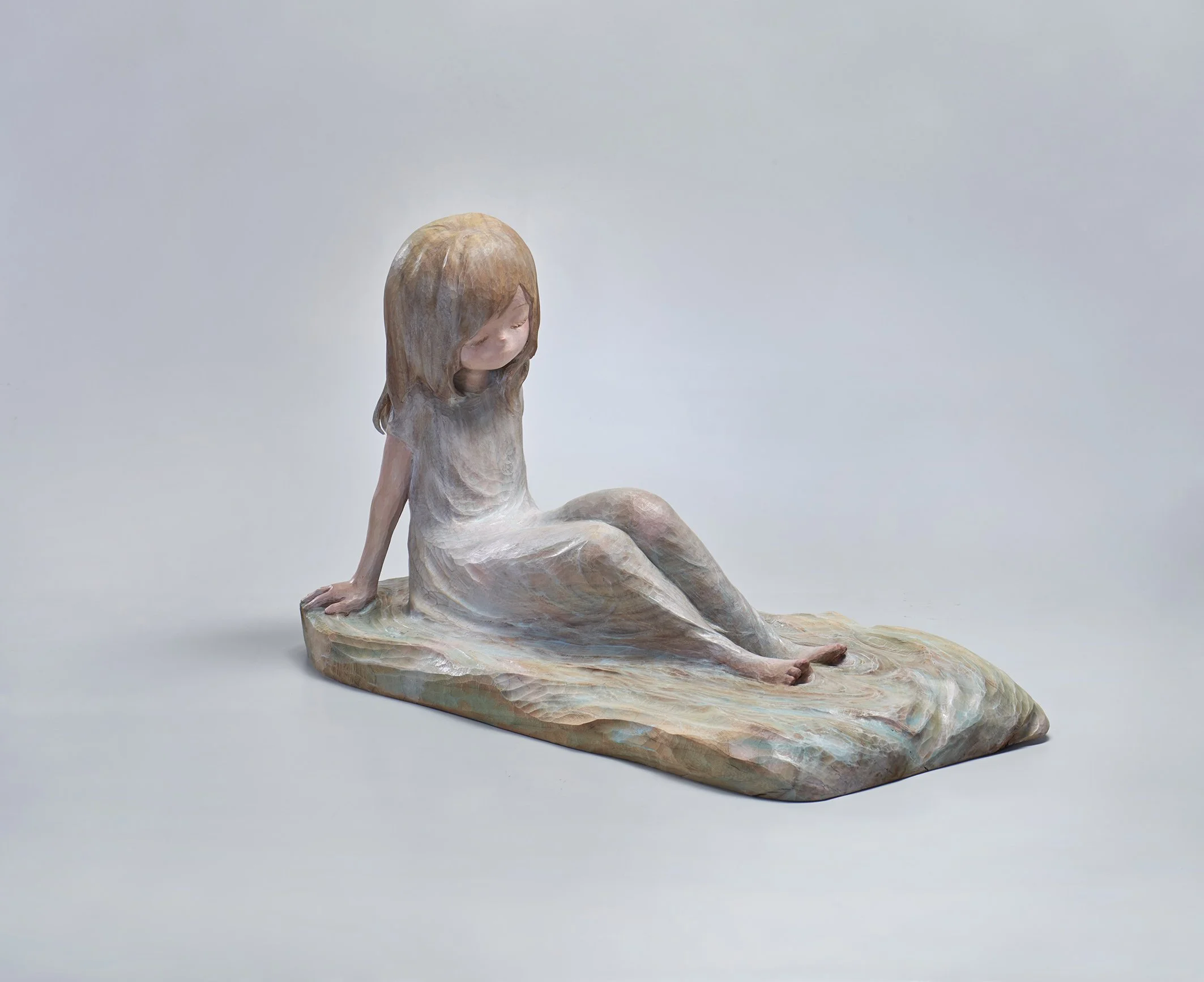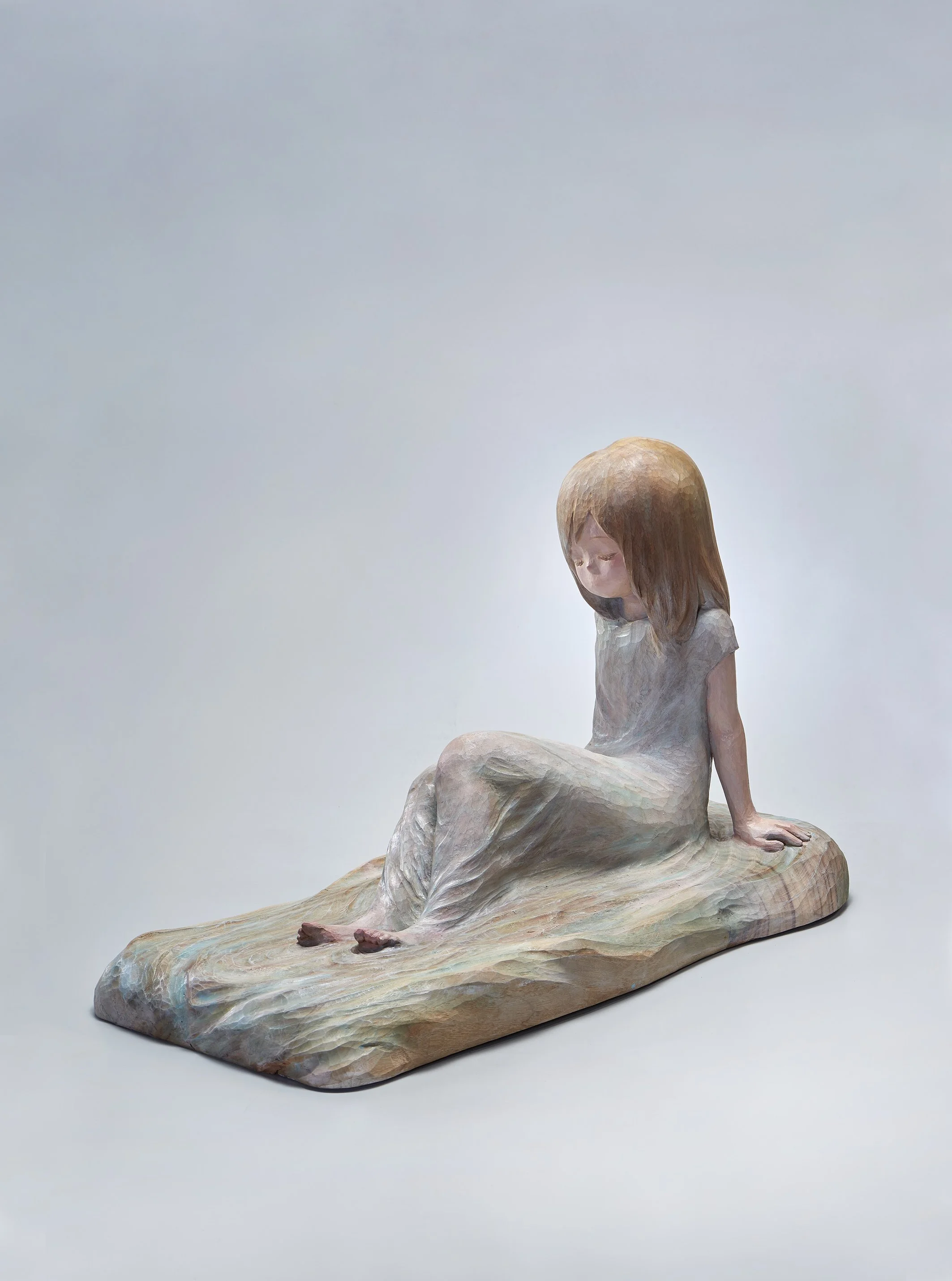 Alone and lonely, time stands still, like a forgotten child, sitting or lying down, sometimes looking up far into the distance, hoping against hope, sometimes closing eyes silently and quietly, the girl seems sad and fragile. It is the contrast and contradiction of one’s inner world, just like little children wish to grow up and the grown hope to get back to childhood. Leaving clear chisel marks, Liu Shin-Yi’s sculptures look like every track of life, so deep, without covering up, while adding on beautiful sweet colours, they look as if the protective colours for hiding real-self during the growing stage. The sad, desperate face means a result of the conflict between her initial dream and anticipation. At last, drawing back the original real-self, she chooses to retain the beautiful innocent form to face the world.