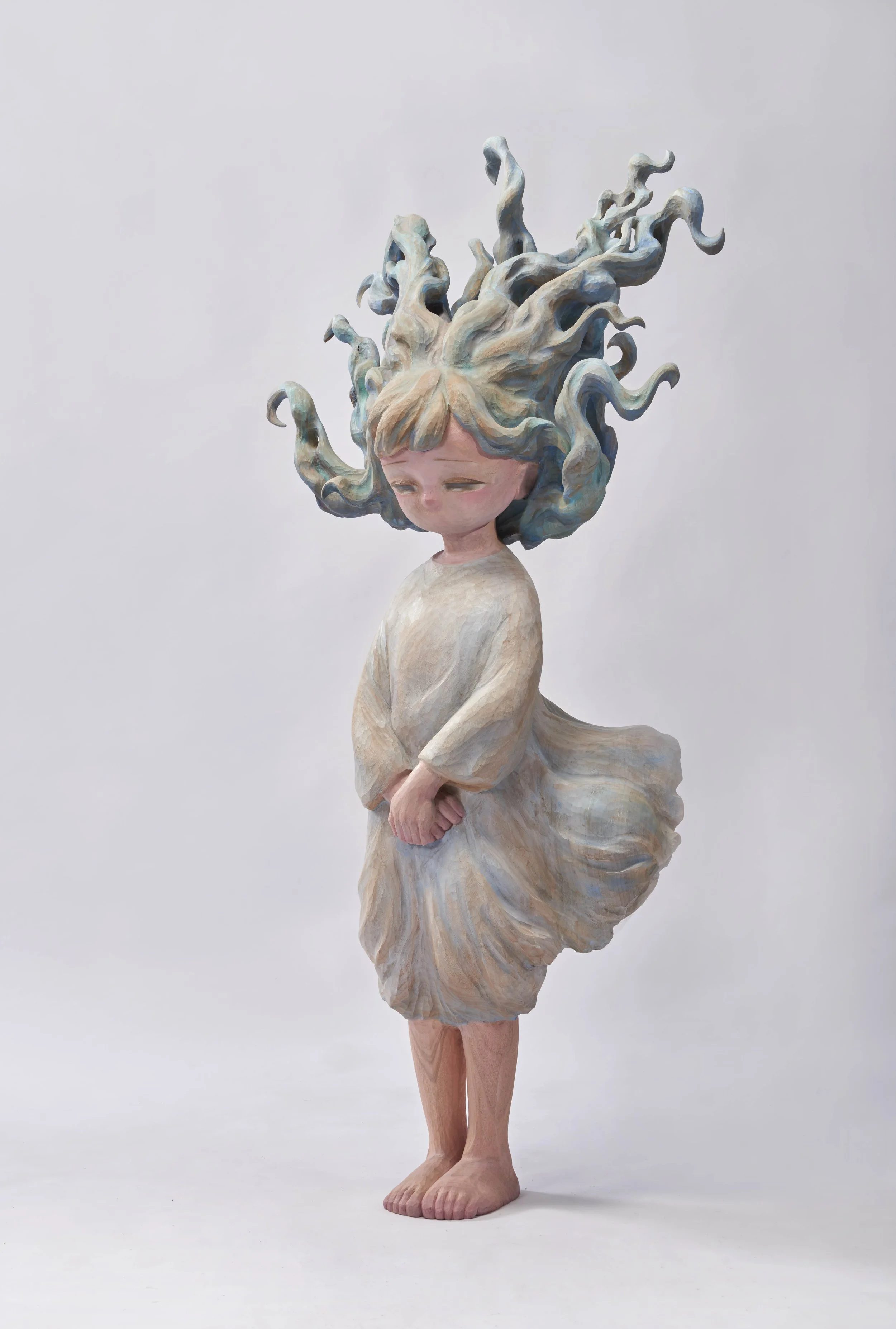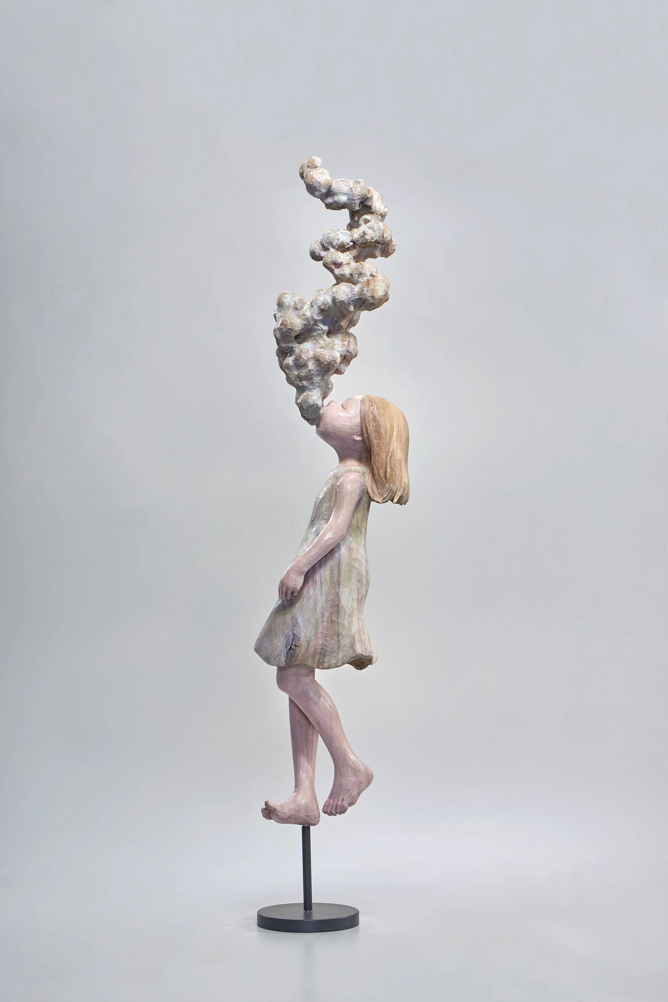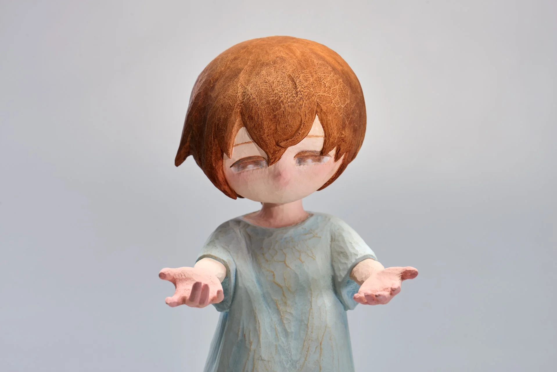 Alone and lonely, time stands still, like a forgotten child, sitting or lying down, sometimes looking up far into the distance, hoping against hope, sometimes closing eyes silently and quietly, the girl seems sad and fragile. It is the contrast and contradiction of one’s inner world, just like little children wish to grow up and the grown hope to get back to childhood. Leaving clear chisel marks, Liu Shin-Yi’s sculptures look like every track of life, so deep, without covering up, while adding on beautiful sweet colours, they look as if the protective colours for hiding real-self during the growing stage. The sad, desperate face means a result of the conflict between her initial dream and anticipation. At last, drawing back the original real-self, she chooses to retain the beautiful innocent form to face the world.