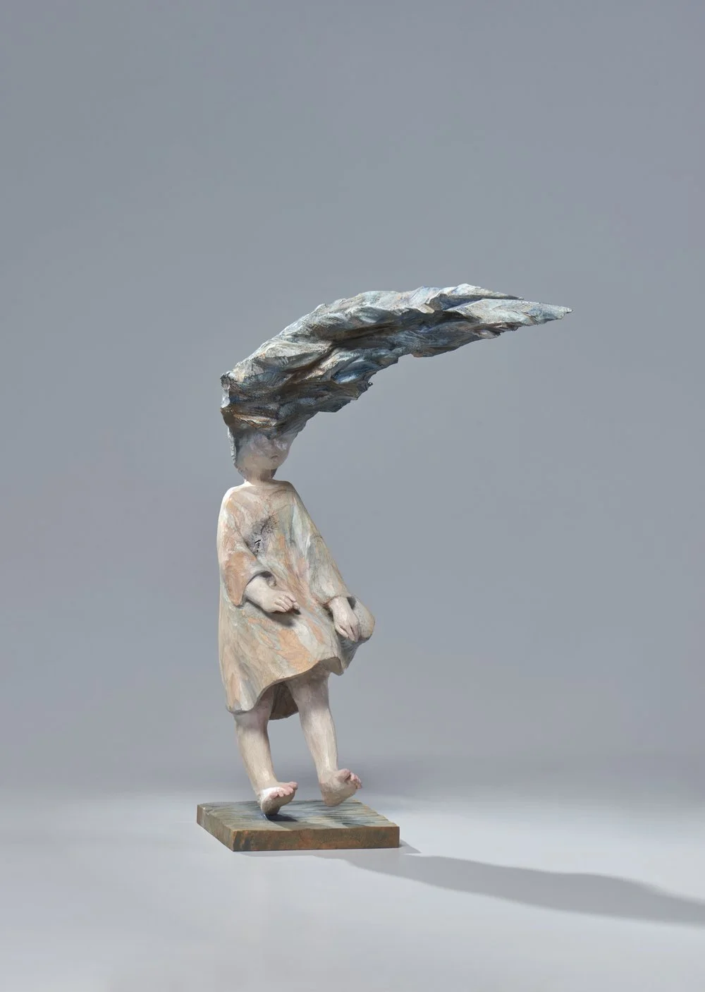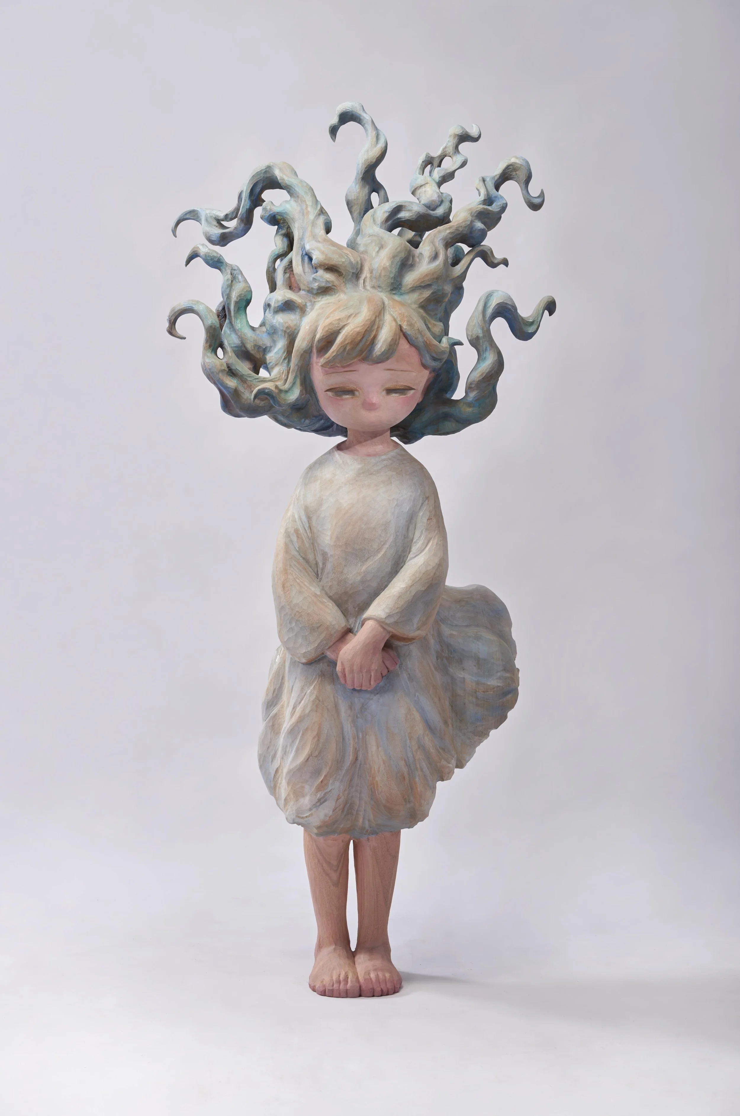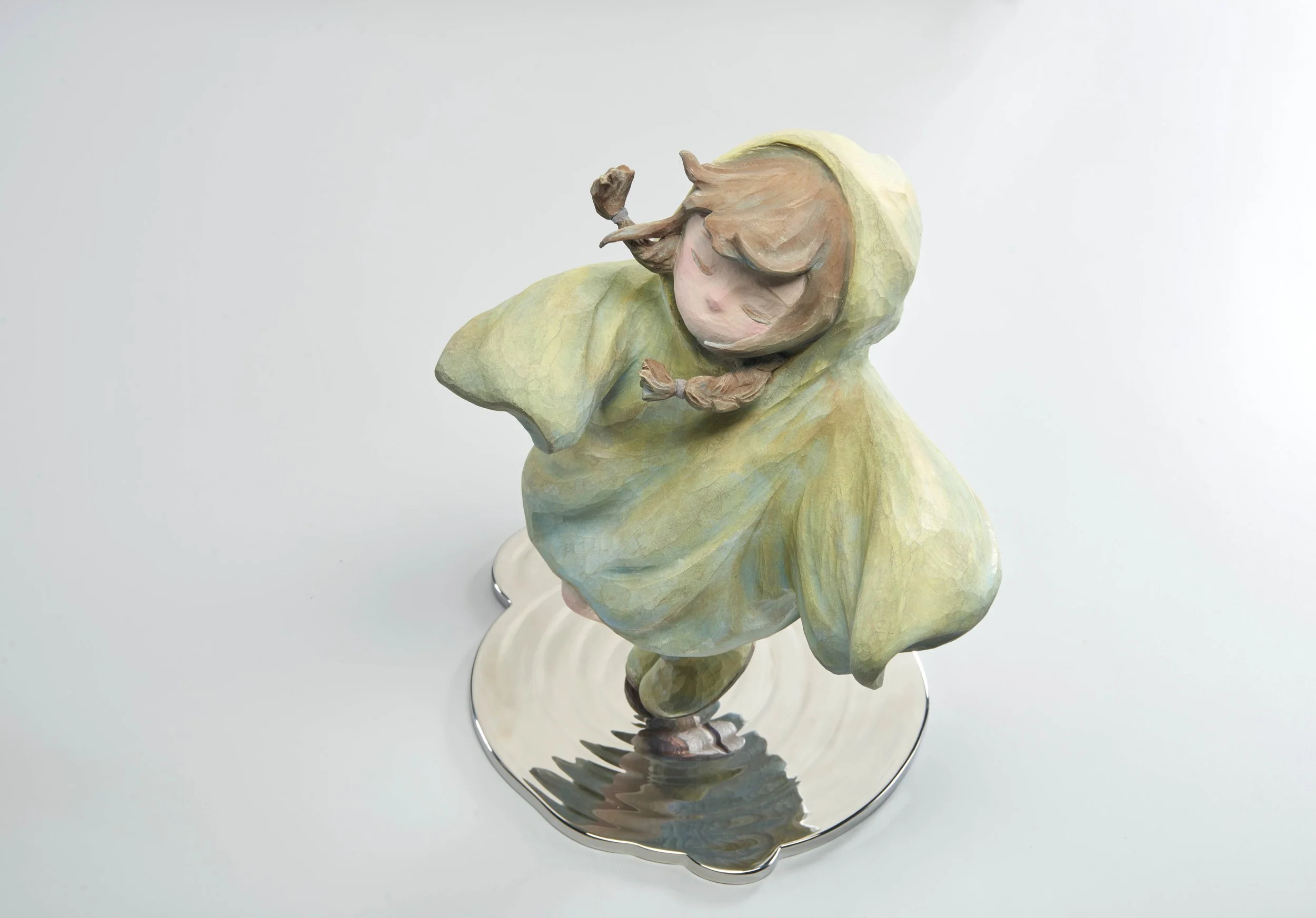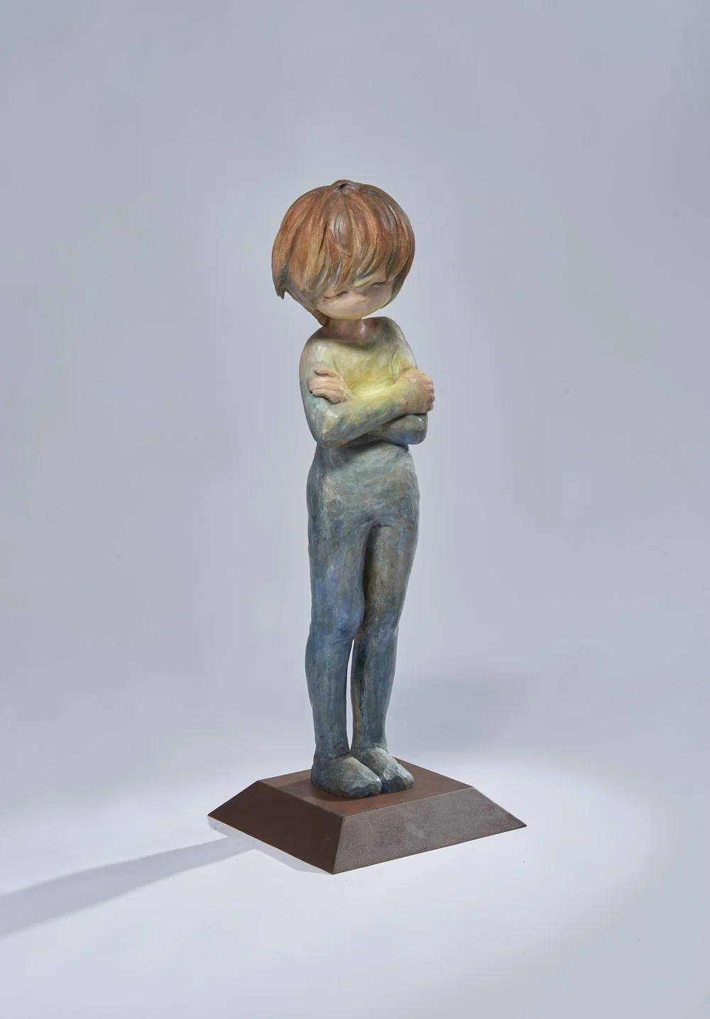 Alone and lonely, time stands still, like a forgotten child, sitting or lying down, sometimes looking up far into the distance, hoping against hope, sometimes closing eyes silently and quietly, the girl seems sad and fragile. It is the contrast and contradiction of one’s inner world, just like little children wish to grow up and the grown hope to get back to childhood. Leaving clear chisel marks, Liu Shin-Yi’s sculptures look like every track of life, so deep, without covering up, while adding on beautiful sweet colours, they look as if the protective colours for hiding real-self during the growing stage. The sad, desperate face means a result of the conflict between her initial dream and anticipation. At last, drawing back the original real-self, she chooses to retain the beautiful innocent form to face the world.