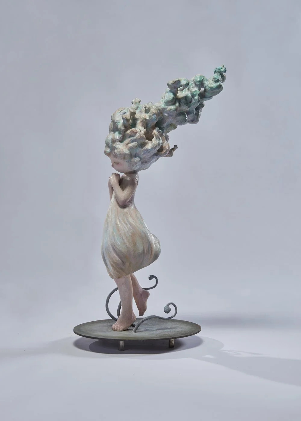 孤獨帶著一絲落寞,而時間忘了向前,好比被遺忘的孩子,或坐或臥,時而抬頭望向遠方尋求一線希望,抑或低頭闔上雙眼沈靜心靈。一股哀傷、脆弱的神情展露在女孩的面容。 那是內心世界的反差與矛盾,如同小時候的我們都妄想長大,卻在長大後渴望回到當初。劉欣宜的雕塑,留下清楚的鑿刻,像是生命中一刀一刀磨練的痕跡,如此深刻、毫無保留,添上甜美爛漫的色彩,宛如在成長的過程,那些試圖掩蓋、偽裝,不輕易展露真實的自我的保護色。 女孩憂愁失望的臉龐,意味著成長中初衷與期待相互牴觸、拉扯的結果,最後選擇將最初的形象退到底線,保留美好天真的狀態來抵抗這世界。