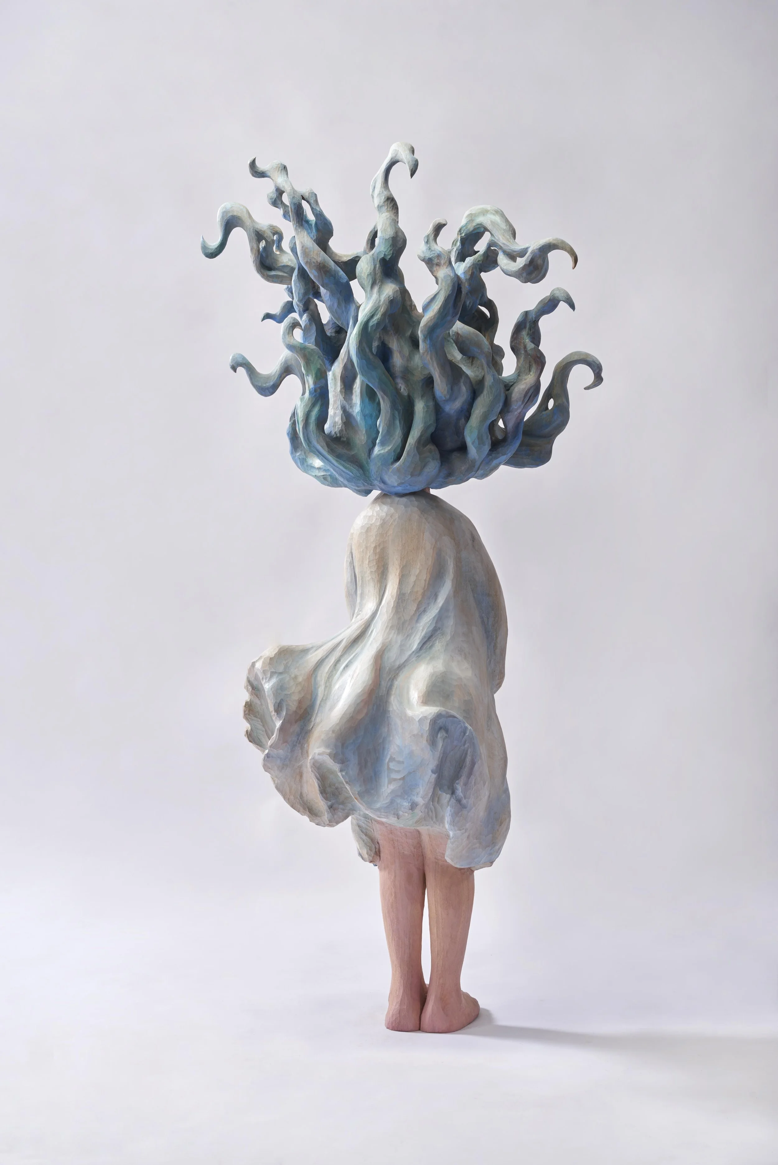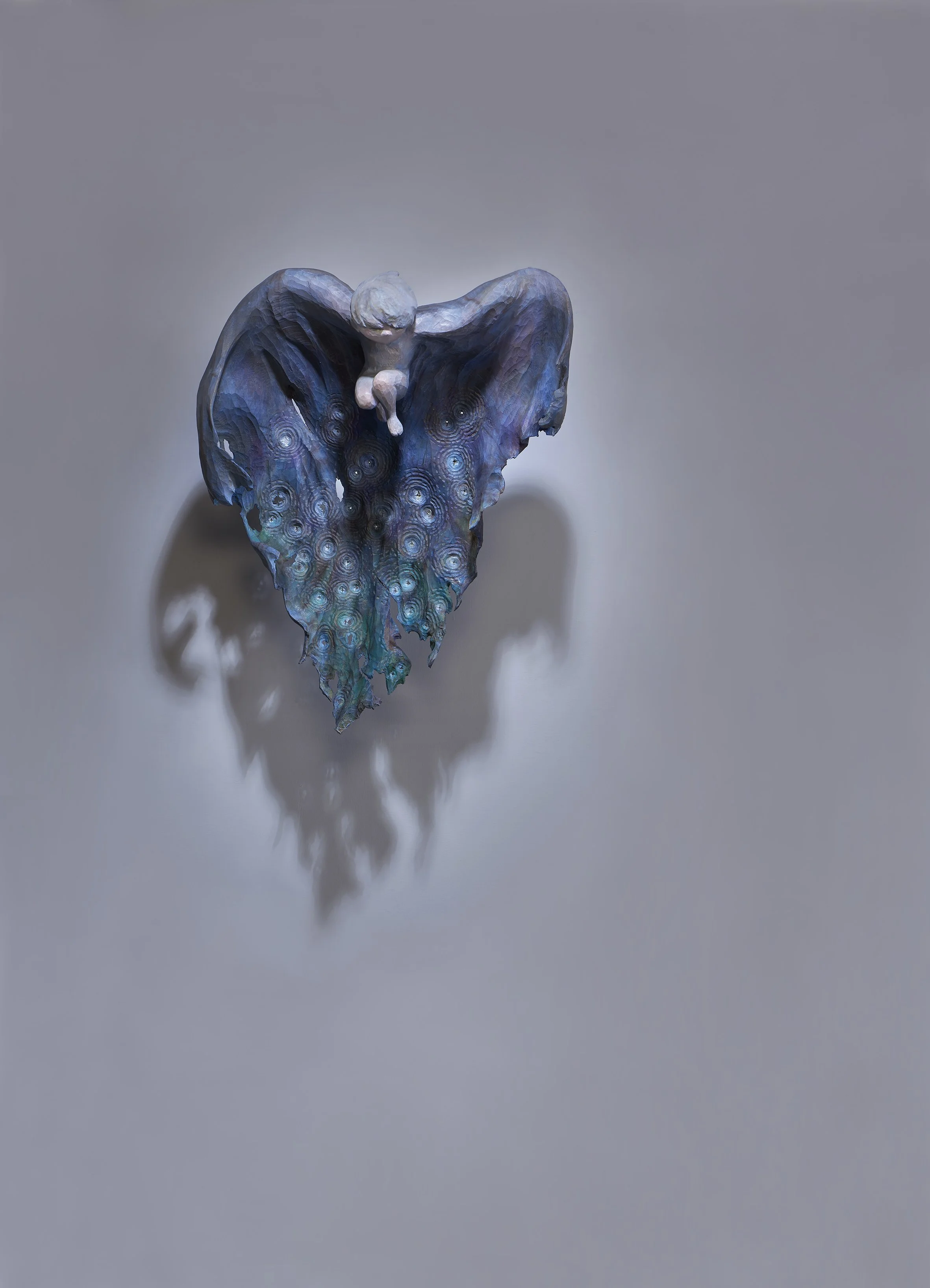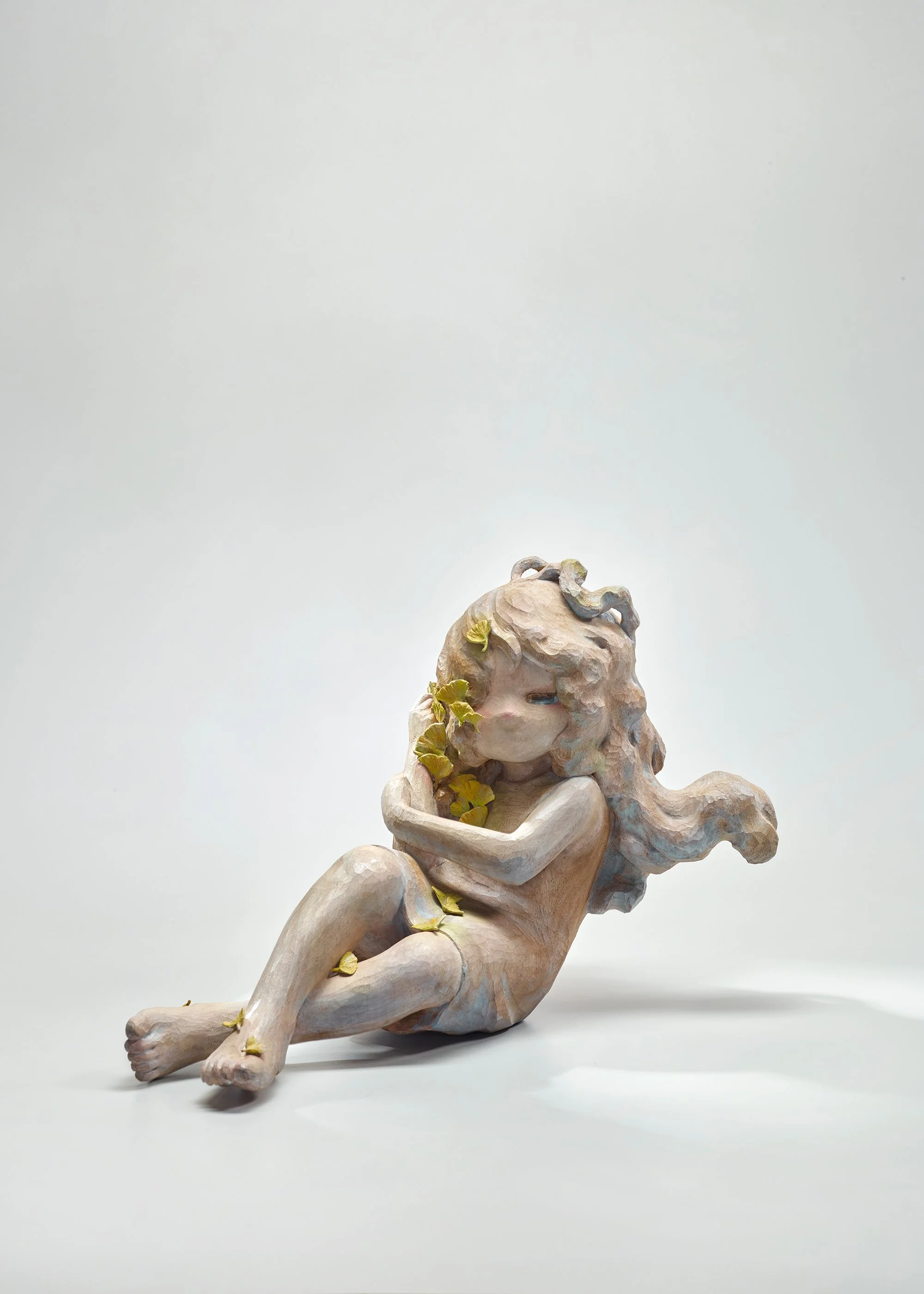The work Enfold was inspired by Sendai, known as the “City of Trees.” The artist imagines herself clothed in leaves, gently brushing her hand by the ear, quietly listening to the rustling foliage. It symbolizes an intimate union with nature, a return to the primordial embrace of verdant life.